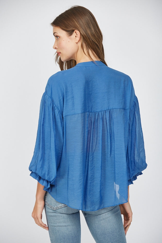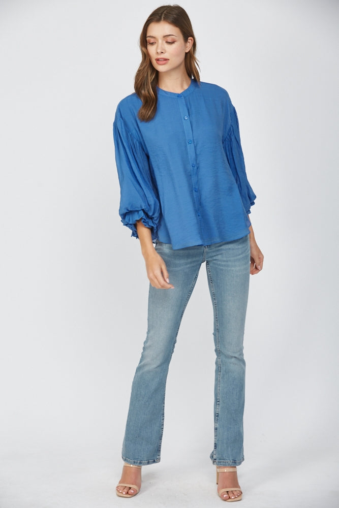 Bring a touch of whimsy to your wardrobe with the Elina French Blue Blouse. Its playful puff sleeves lined for extra comfort add charm to the classic button-down style. Crafted from a soft blend of 75% rayon and 25% polyester, this blouse offers a light, breezy feel perfect for any day. Elevate your look with a splash of color and flirty flair!