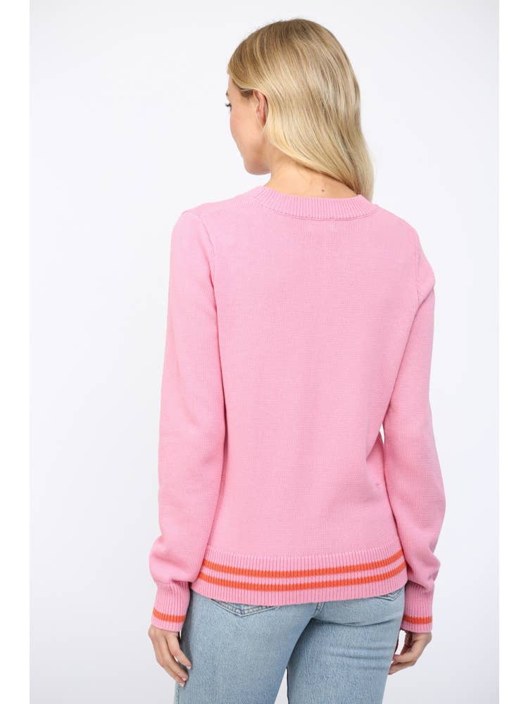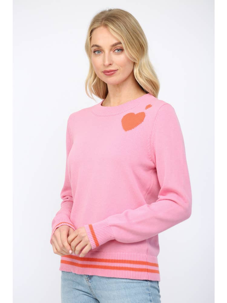 Spread the love in this delightful intarsia knit sweater featuring a charming heart pattern in pink and orange. Crafted from 100% soft cotton, it's breathable enough for layering through the seasons while keeping you cozy and comfortable. The playful color combo brings instant warmth to any outfit—pair it with your favorite jeans for effortless style. Model is 5'9½" for fit reference.