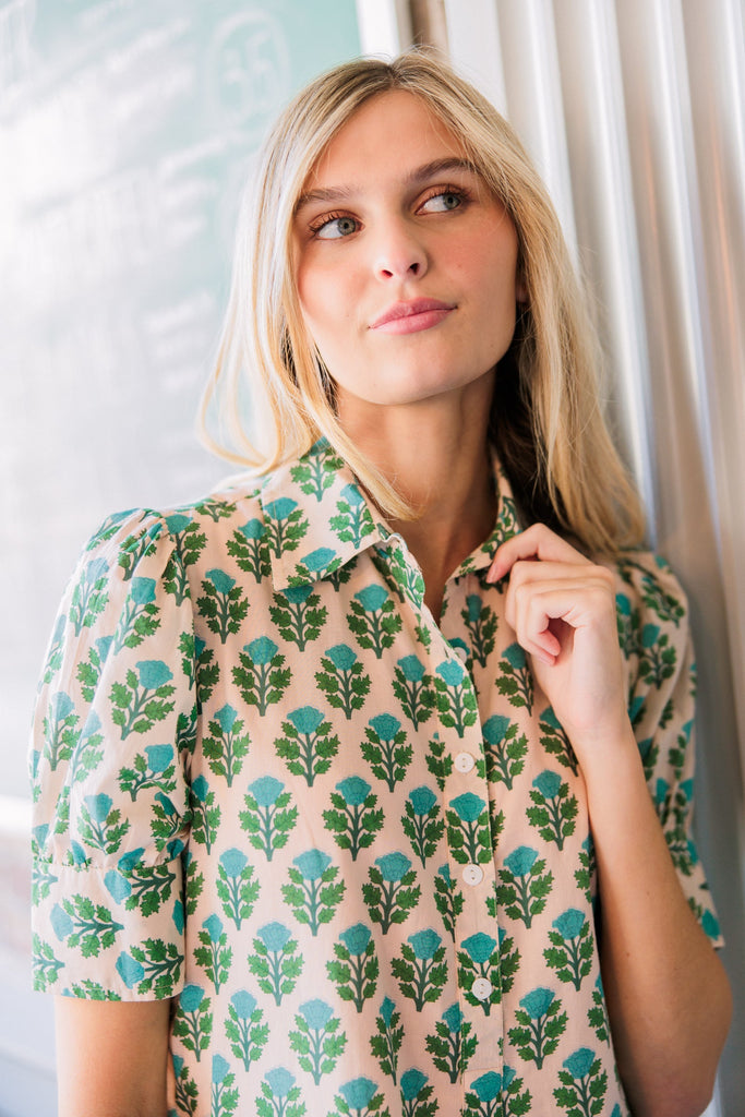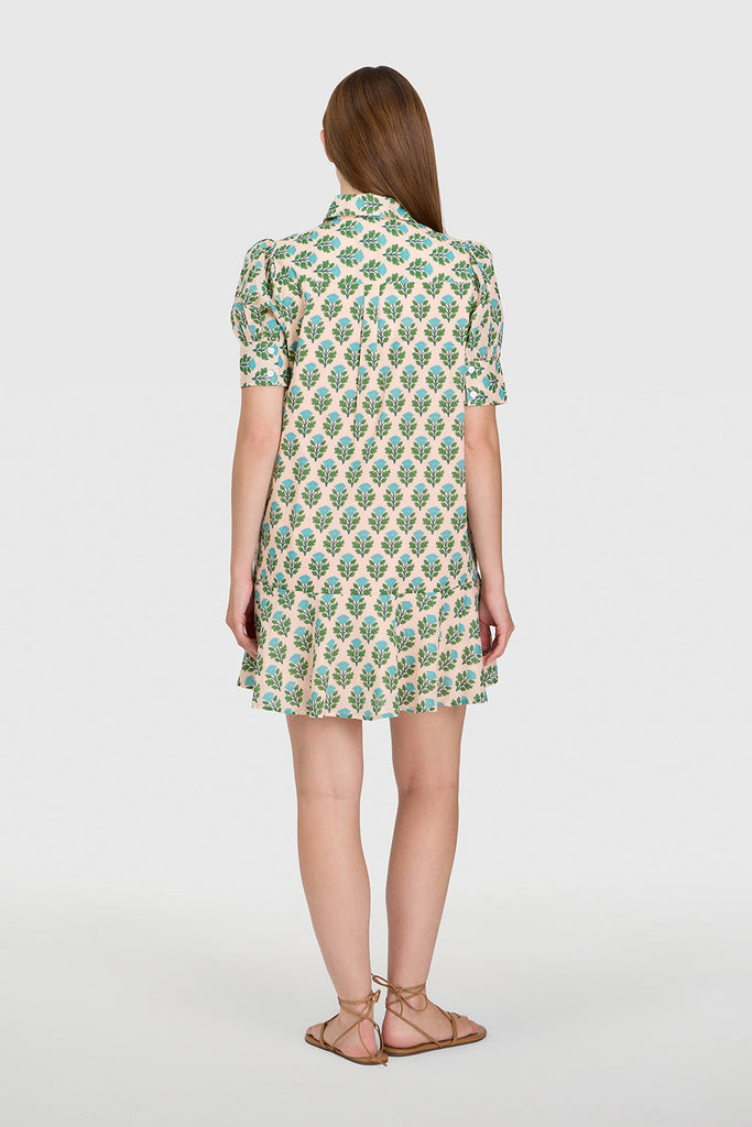 The Liv Dress is a playful mini dress with a tailored bodice and a relaxed drop-waist silhouette. It features short puff sleeves with cuff detailing, a classic shirt collar, and a partial button placket down the front. The skirt is finished with a flounced hem for a feminine, swingy shape.