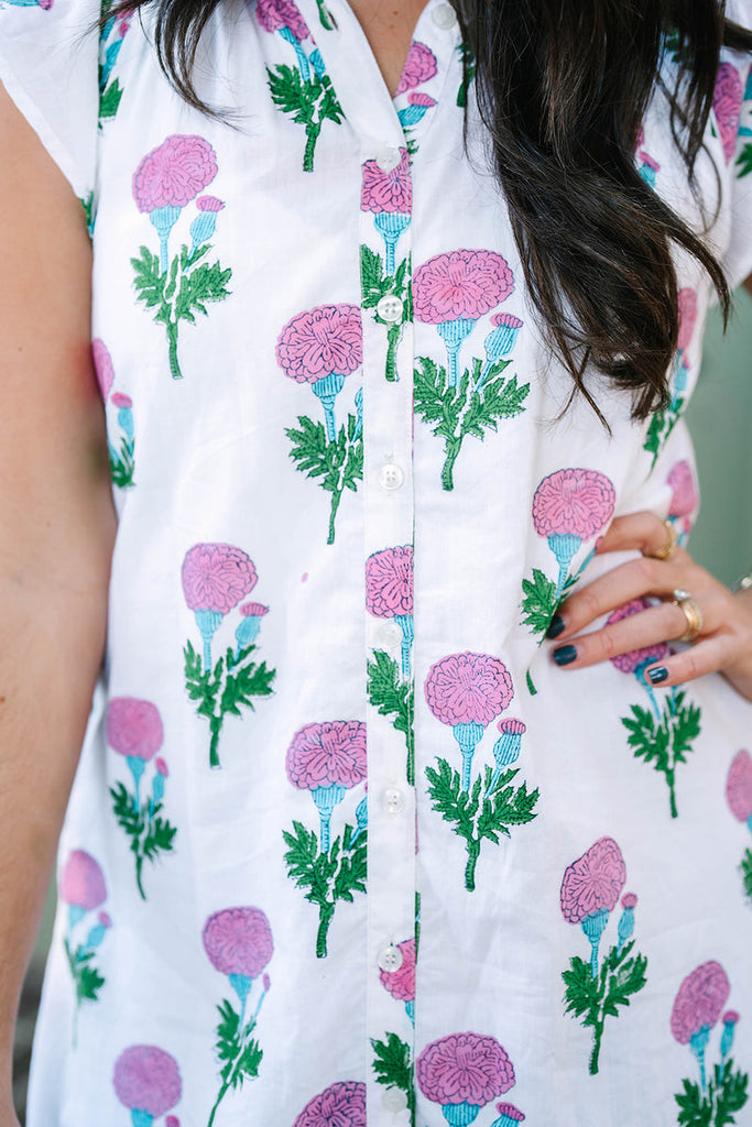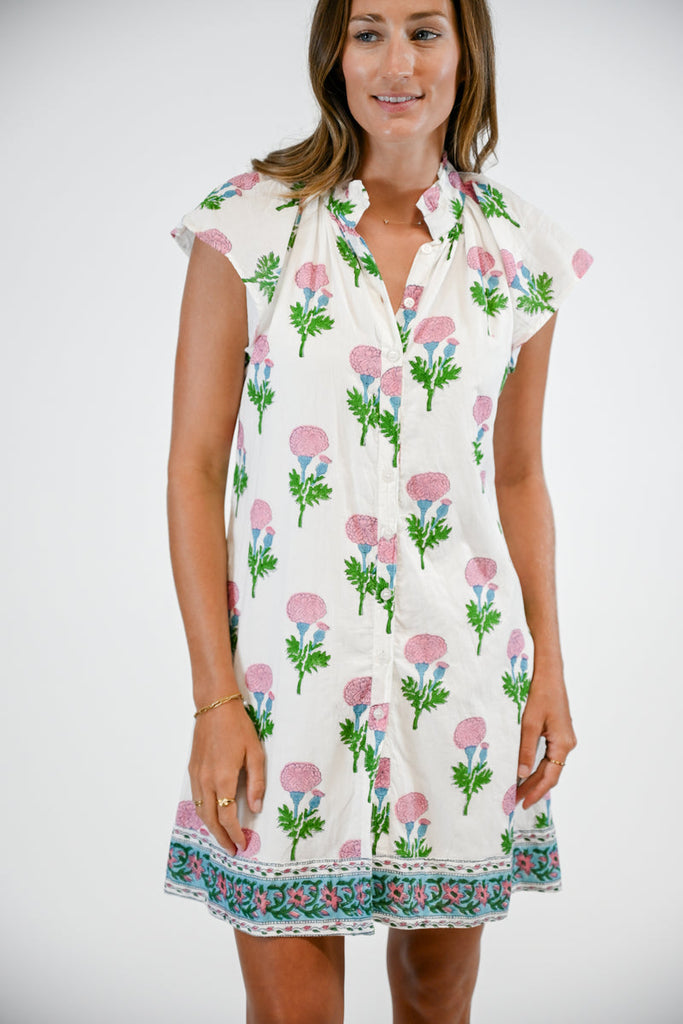 The Lucia Dress in Passion Flower is a versatile warm-weather essential crafted by skilled artisans in Jaipur, India. This loose-fitting short-sleeve dress features a charming ruffle collar, contrasting hem, and button-down front for effortless style. Made from 100% cotton with a soft lining, it transitions seamlessly from beach days to evening outings. Hand-blocked construction ensures each piece is beautifully unique. Hand-wash only. Model wears size XS. Please note: dye variations and natural imperfections are part of the artisanal charm.