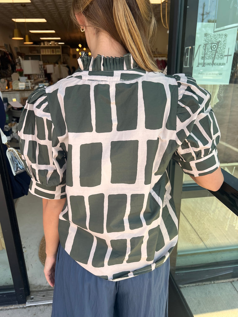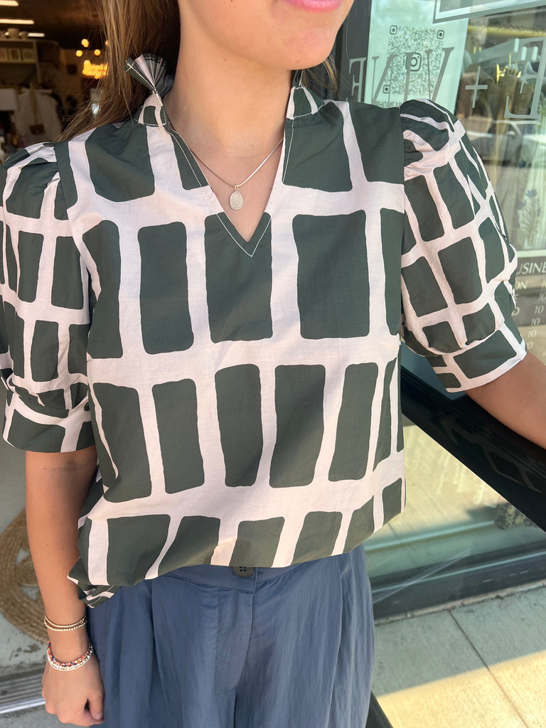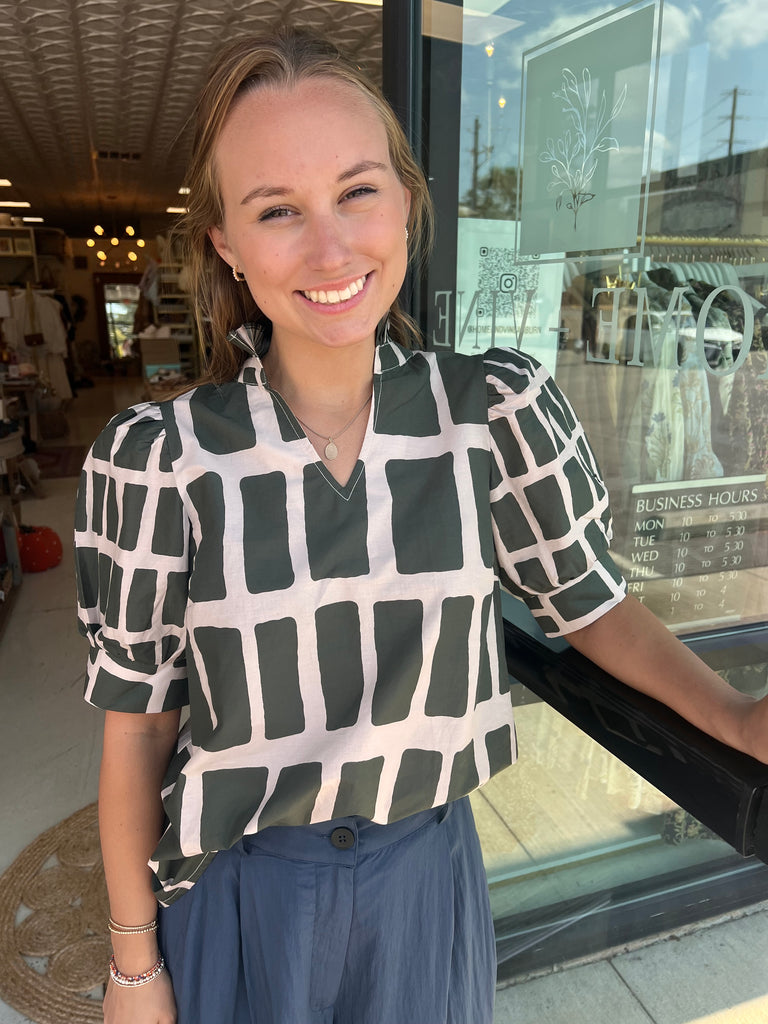 Add a splash of fun to your wardrobe with the Gigi Top! This lightweight pullover features a playful abstract print and a charming pleated ruffle accent along the V-neck. Its short sleeves and breathable woven fabric keep you comfortable all day, while the unlined, non-sheer design makes it perfect for layering or wearing on its own. Effortlessly stylish and ready for any casual outing!