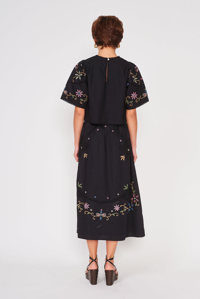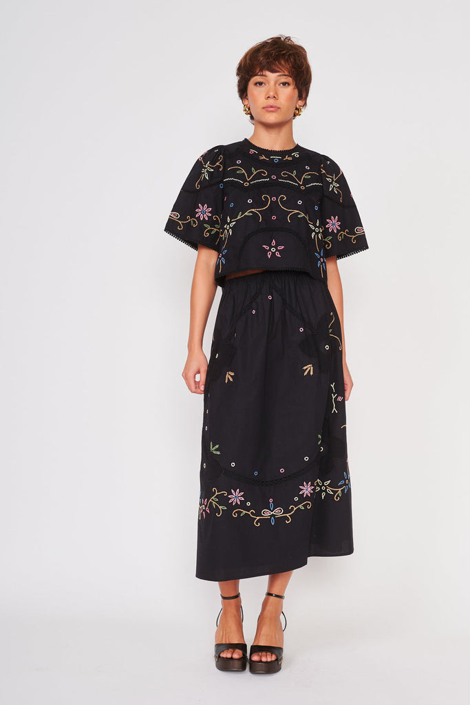 Make a statement in this Black Embroidery crop top featuring wide sleeves and vibrant, artisan-inspired floral details. Finished with playful black pom pom trim for a fun, boho-chic vibe, pair this top with the Arcadian skirt for a chic, twinset look.