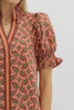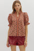Astract pattern smocked cuff band short puff sleeve top featuring multicolor accent V-neck smocked high neck band. Unlined. Woven. Non-sheer. Lightweight.