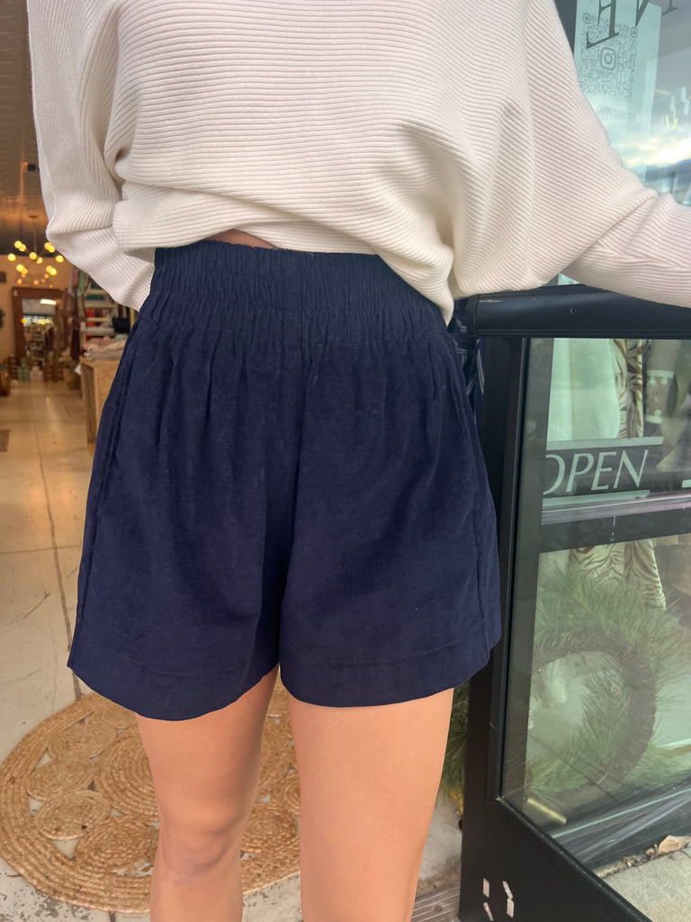 Bring cozy vibes to your fall wardrobe with these high-waisted Reilly Navy Corduroy Shorts. Perfect for game day or casual outings, their soft corduroy fabric and flattering fit keep you comfy and stylish all season long. Pair them with your favorite sweater and sneakers for an effortlessly fun look!