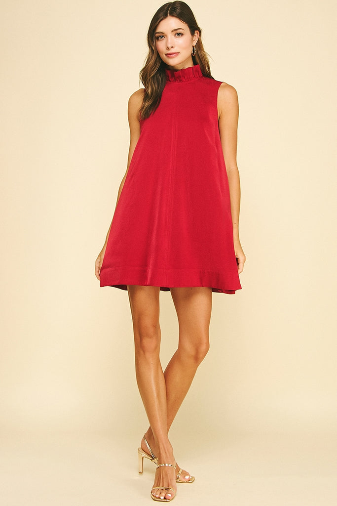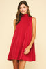 The Rozika Red Mini Dress features a refined mock neck and elegant back tie detail, enhancing its sophisticated silhouette. Sleeveless and equipped with convenient side pockets, this dress combines style with subtle practicality, perfect for polished, confident wear.