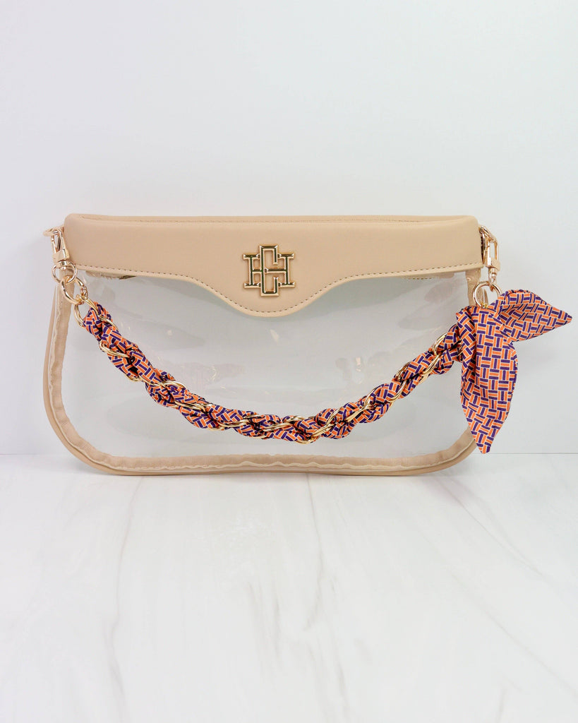 Add a pop of school spirit with a twist of elegance using the Serafina Scarf Purse Chain in Navy and Orange. This playful accessory pairs a chic gold link chain with a vibrant printed scarf, perfect for dressing up your handbag with personality and flair. Measuring 14.75" across and finished with a handy metal snap-buckle closure, it’s the stylish accent your bag has been waiting for.