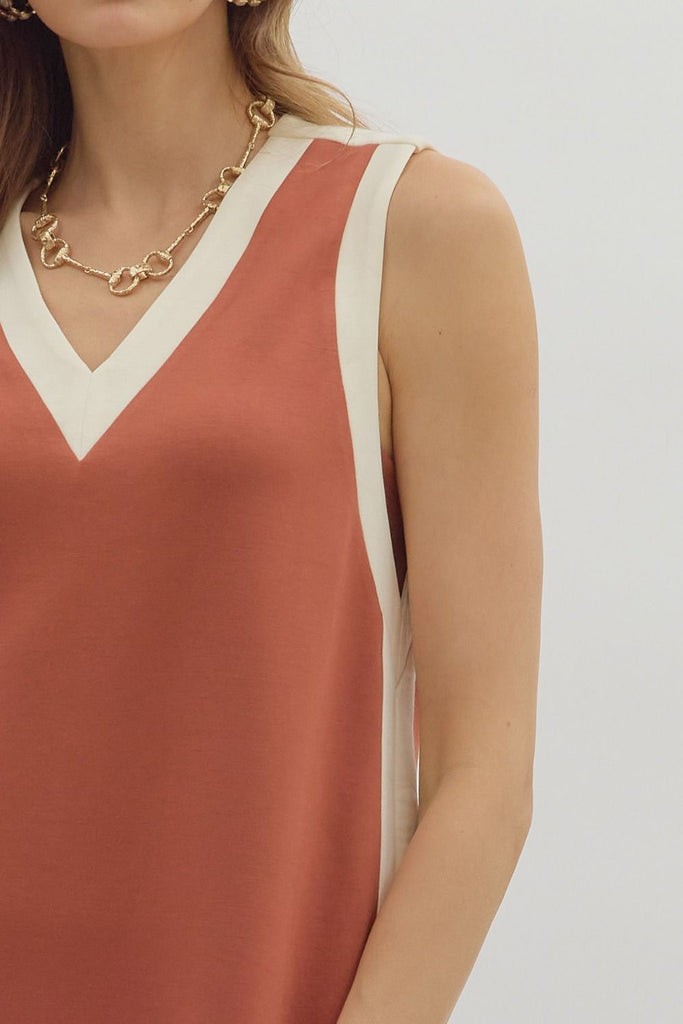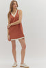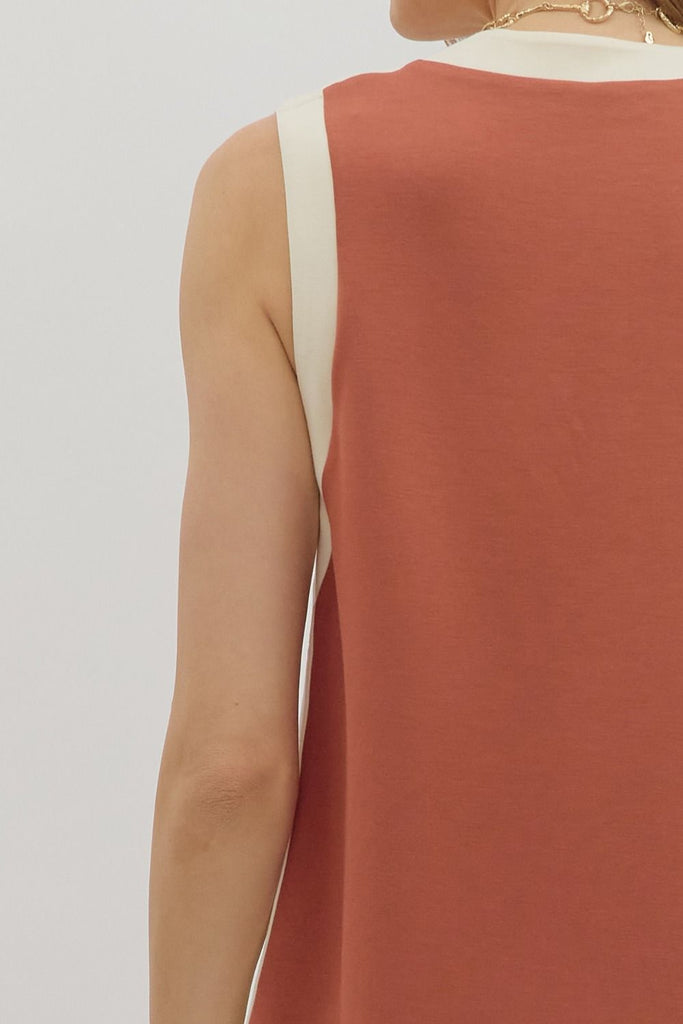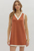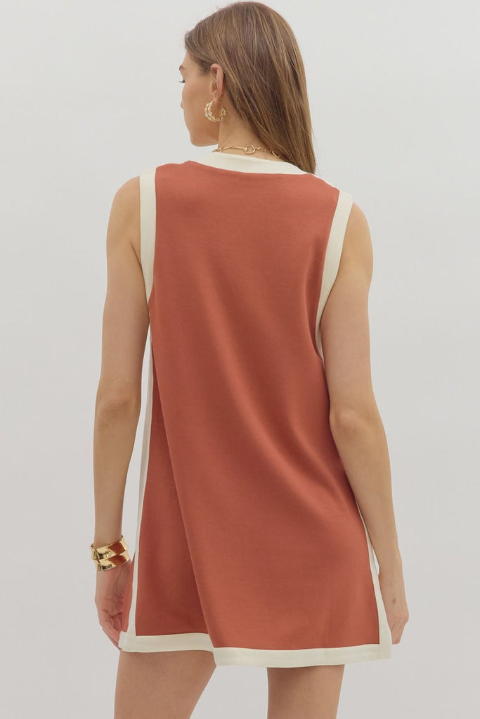 The playful Shyla Clay Mini Dress brings varsity vibes with its solid sleeveless design and bold contrast band detailing. This lightweight, non-sheer knit dress offers easy pullover style for quick, casual wear. Crafted from a soft blend of rayon, cotton, and spandex, it provides comfort and just the right amount of stretch. Perfect for sporty days or laid-back outings, this mini dress combines effortless style with all-day wearability.