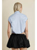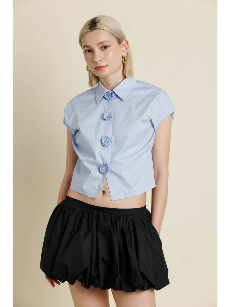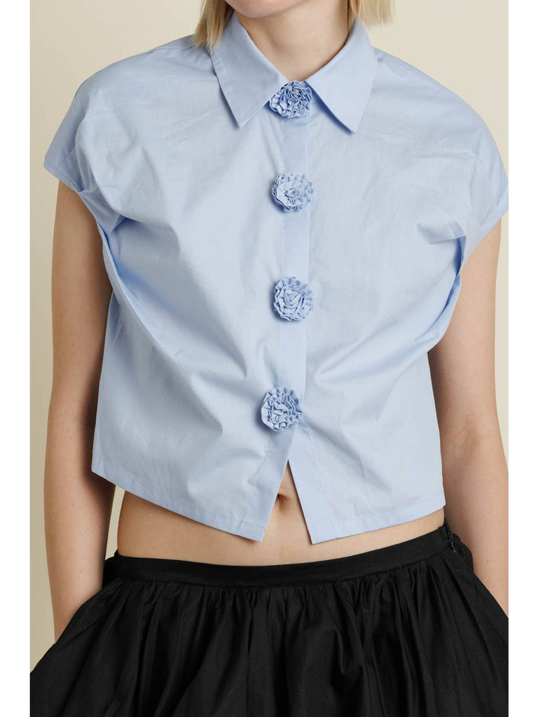 Brighten your day with the Sunny Afternoon Blouse, crafted from crisp non-stretch cotton poplin. Its relaxed drop shoulder and cap sleeves create an easygoing vibe, while delicate flower appliques along the snap button placket add a whimsical touch. Perfect for pairing with your favorite jeans or skirts, this blouse brings a playful pop of floral charm to any outfit. Model is 5'9" and wearing a size Small.