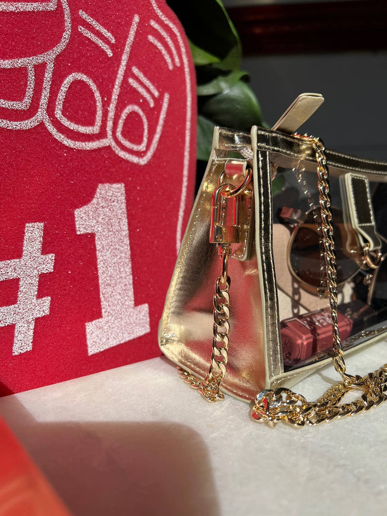 The Emma Gameday Metallic Champagne Purse by TAYLOR GRAY is your bold, game-ready companion. Crafted from sleek vegan leather, this clear metallic champagne purse meets stadium regulations while keeping your essentials—phone, sunglasses, lipstick—secure and stylish. It includes a matching ID wallet perfectly sized for your ID, credit cards, and cash, plus a striking 47-inch gold chain for hands-free confidence. Stand out with this daring accessory that blends practicality with a touch of glam. Dimensions: Purse 8" x 4.5" x 3.5", ID wallet 4.25" x 3".