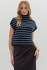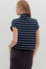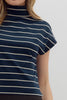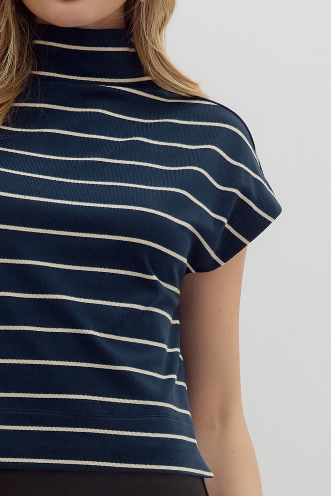 Stripe pattern mock neck jersey knit pullover top. Unlined. Knit. Non-sheer. Lightweight.