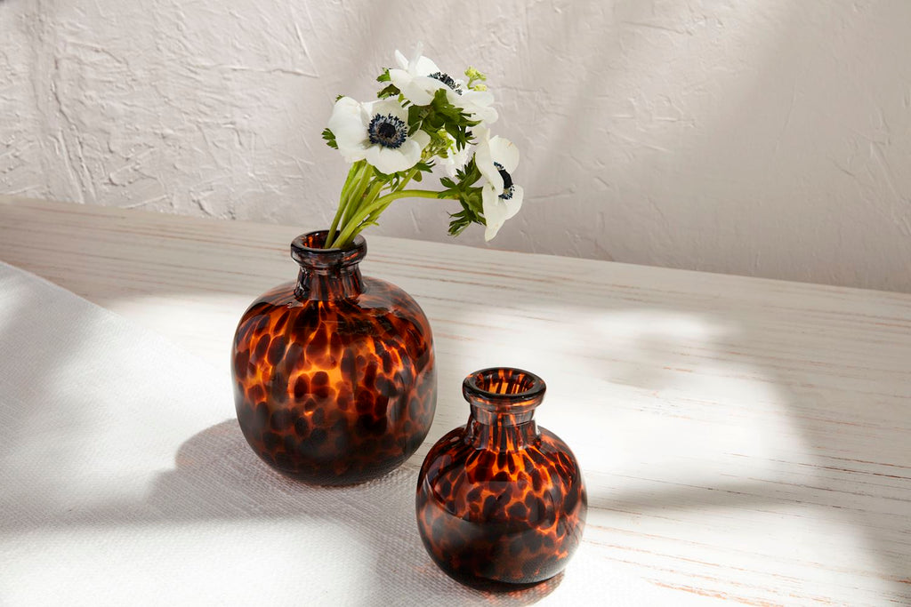 Elevate your home decor with our stunning Tortoise Glass Vases! Available in two sizes, these hand-crafted vases bring a touch of elegance to any space. Perfect for showcasing your favorite flowers or adding a pop of color to a room. Upgrade your style with our Tortoise Glass Vase today!