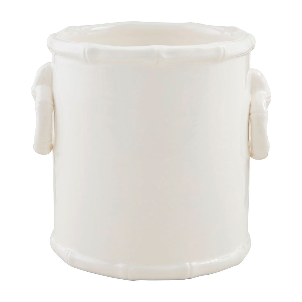 Organize your kitchen in style with our White Bamboo Utensil Holder! Made from durable stoneware, it features convenient side ring handles and a beautiful bamboo texture. At 6" x 5 1/2" in diameter, it's the perfect size for all your cooking utensils. A must-have for any home chef!